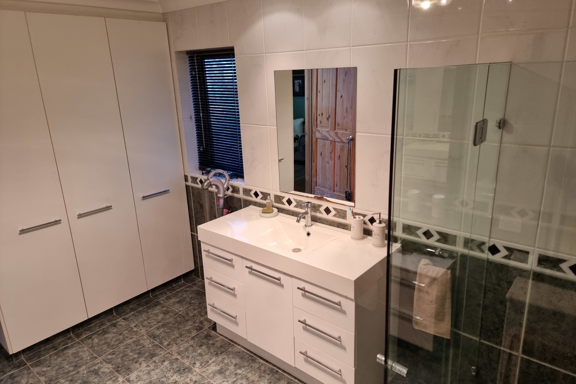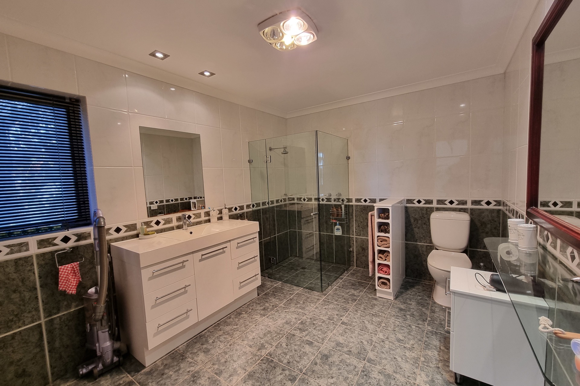 Prepare to be impressed by the modern bathroom, featuring frameless shower, chic accent tiling, and spacious vanity and basin that add a touch of sophistication.